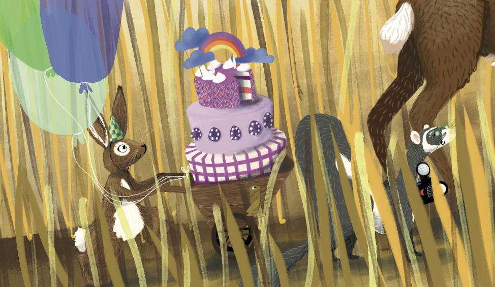 Alle dieren uit het bos lopen in een lange stoet. Ze nemen cadeautjes, taart en feesthoedjes mee, want... er is een verjaardag! Maar van wie? En welke verrassing staat er op hen te wachten?